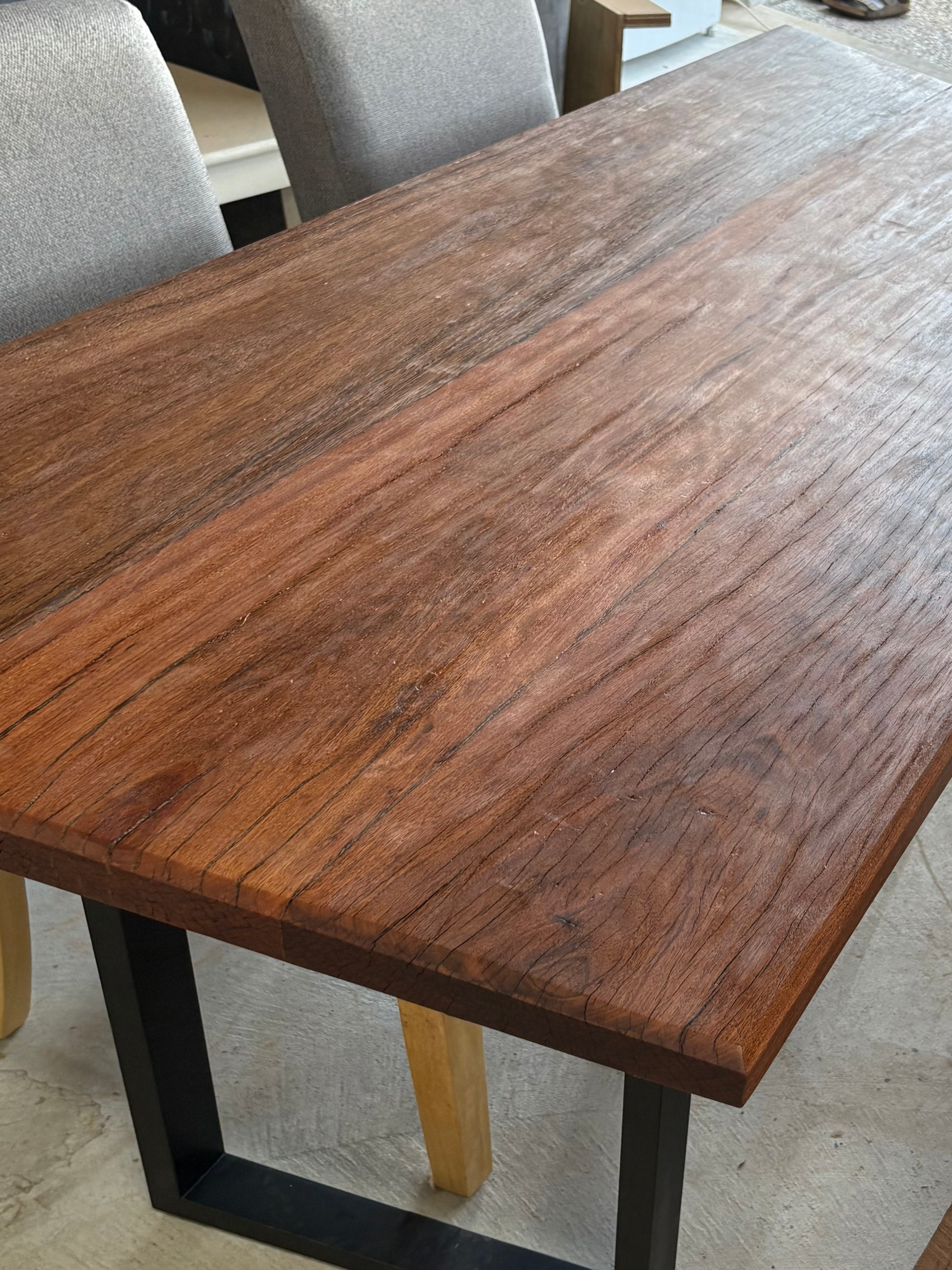 A reclaimed Australian Hardwood Dining table or Office desk measuring 1500mm(L) x 735 (W) x 765mm (H) Big enough to seat 4 or ample room for a professional office desk. This unique piece combines durability with ease of maintenance, ensuring it will last for generations. The table features Sturdy black metal legs with self leveling and adjustable feet, making it s perfect addition to any home.